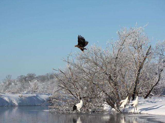 Paddle your way into a silent world of winter as you go along the Kushiro River to Lake Touro. Discover the amazing sights and sounds of the still lively wetlands all around.