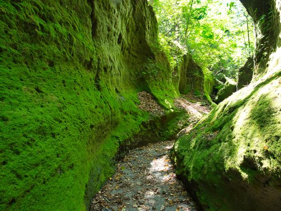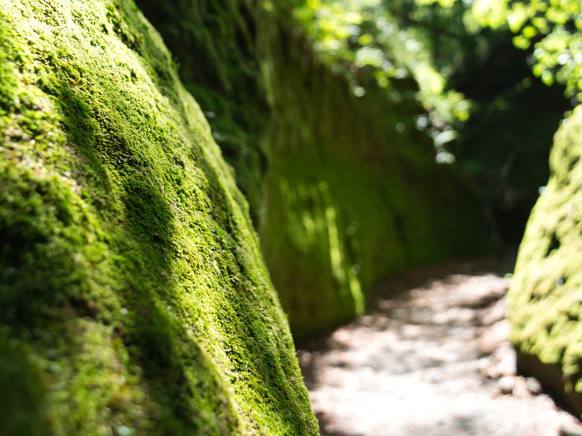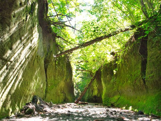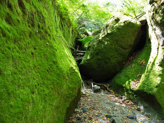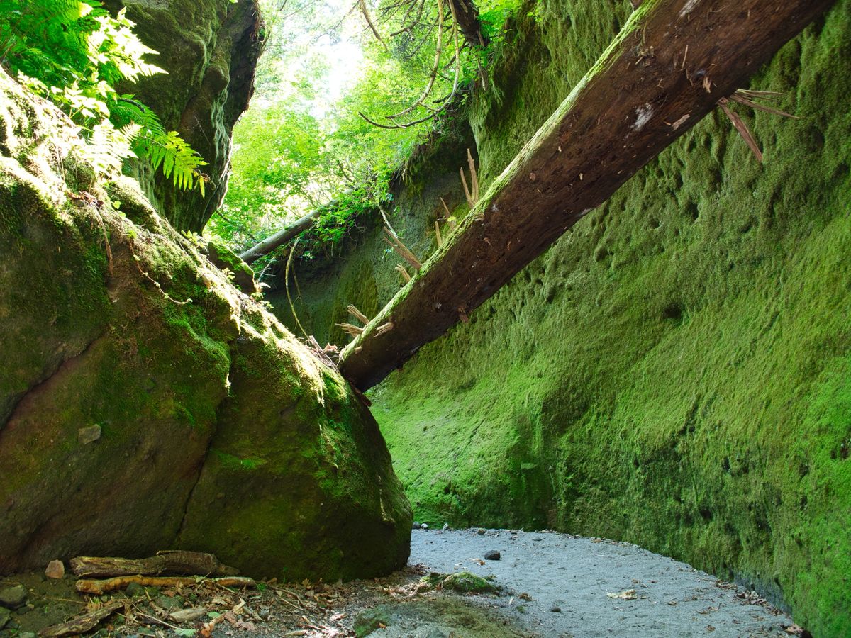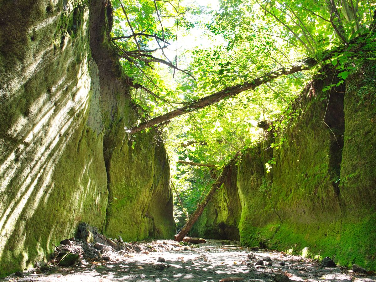 Explore a hidden, ancient-like gorge! A corridor-shaped dry valley formed by lava eroded by debris flows from volcanic activity, with walls about 10m high. Over 80 species of moss, including shrimp moss, densely cover the area.