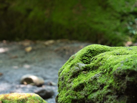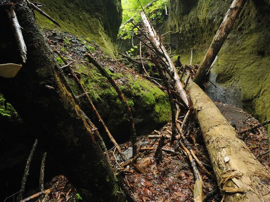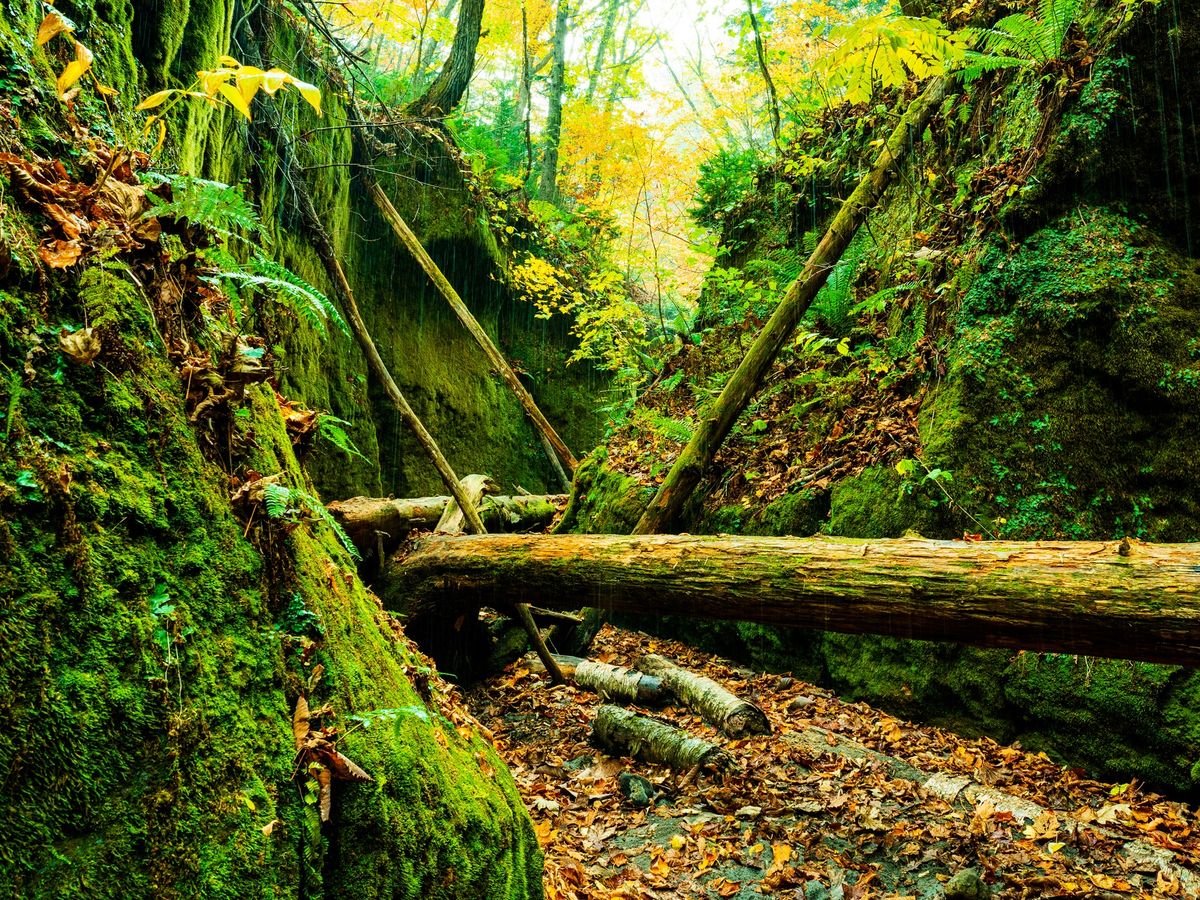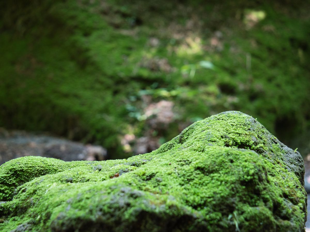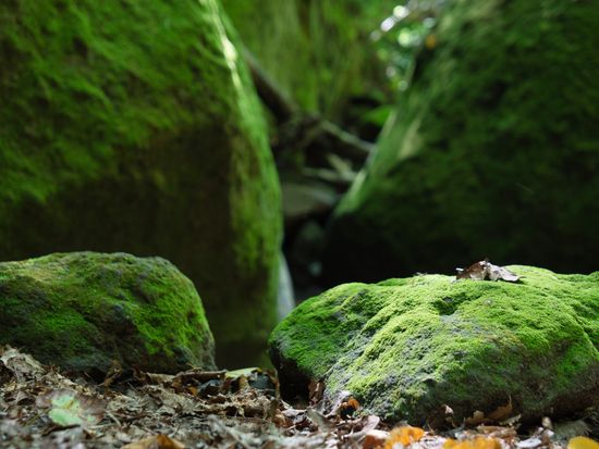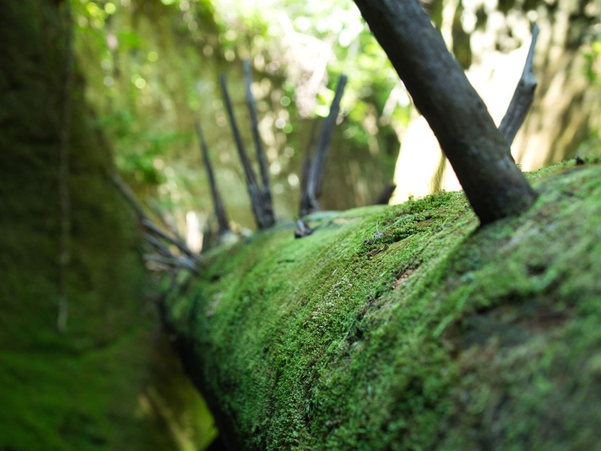 Explore a hidden, ancient-like gorge! A corridor-shaped dry valley formed by lava eroded by debris flows from volcanic activity, with walls about 10m high. Over 80 species of moss, including shrimp moss, densely cover the area.