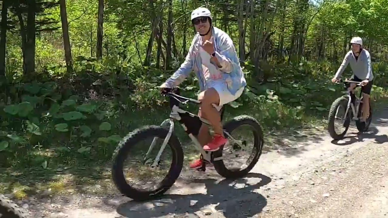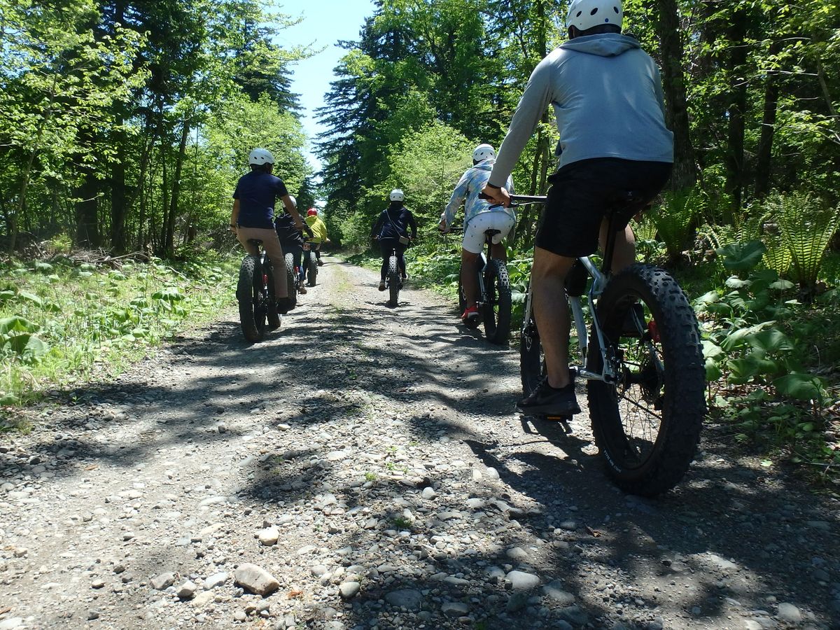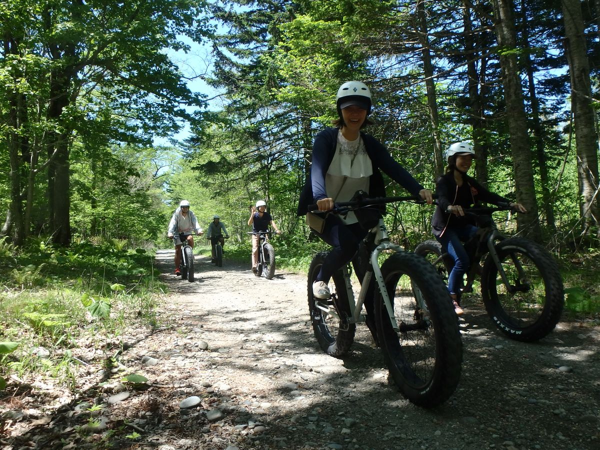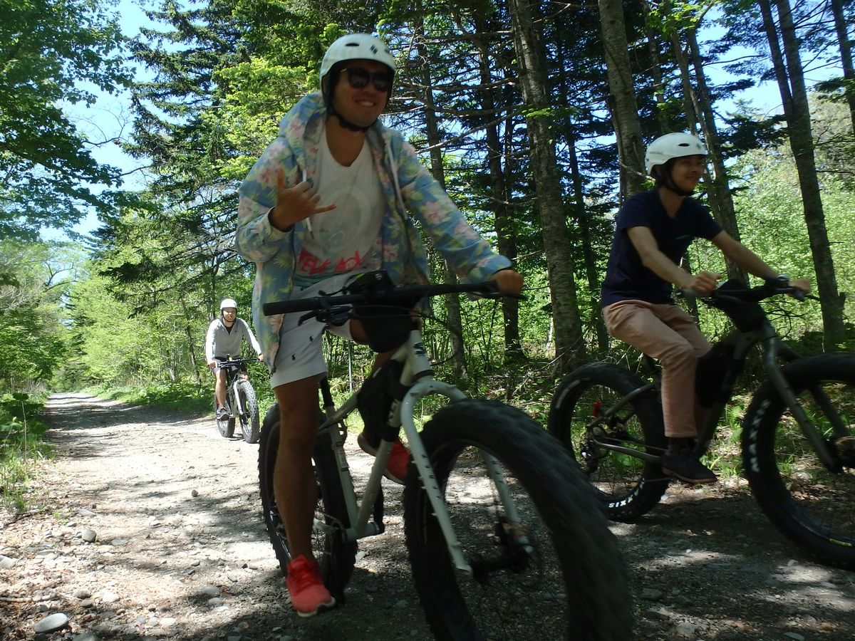 A cycling tour on a fat bike with oversized tires, perfect for snow and rough terrain, heading from Shikotsu Lake National Park to Nanajo Otaki Falls. Beginners are welcome, with a pre-departure lesson included!