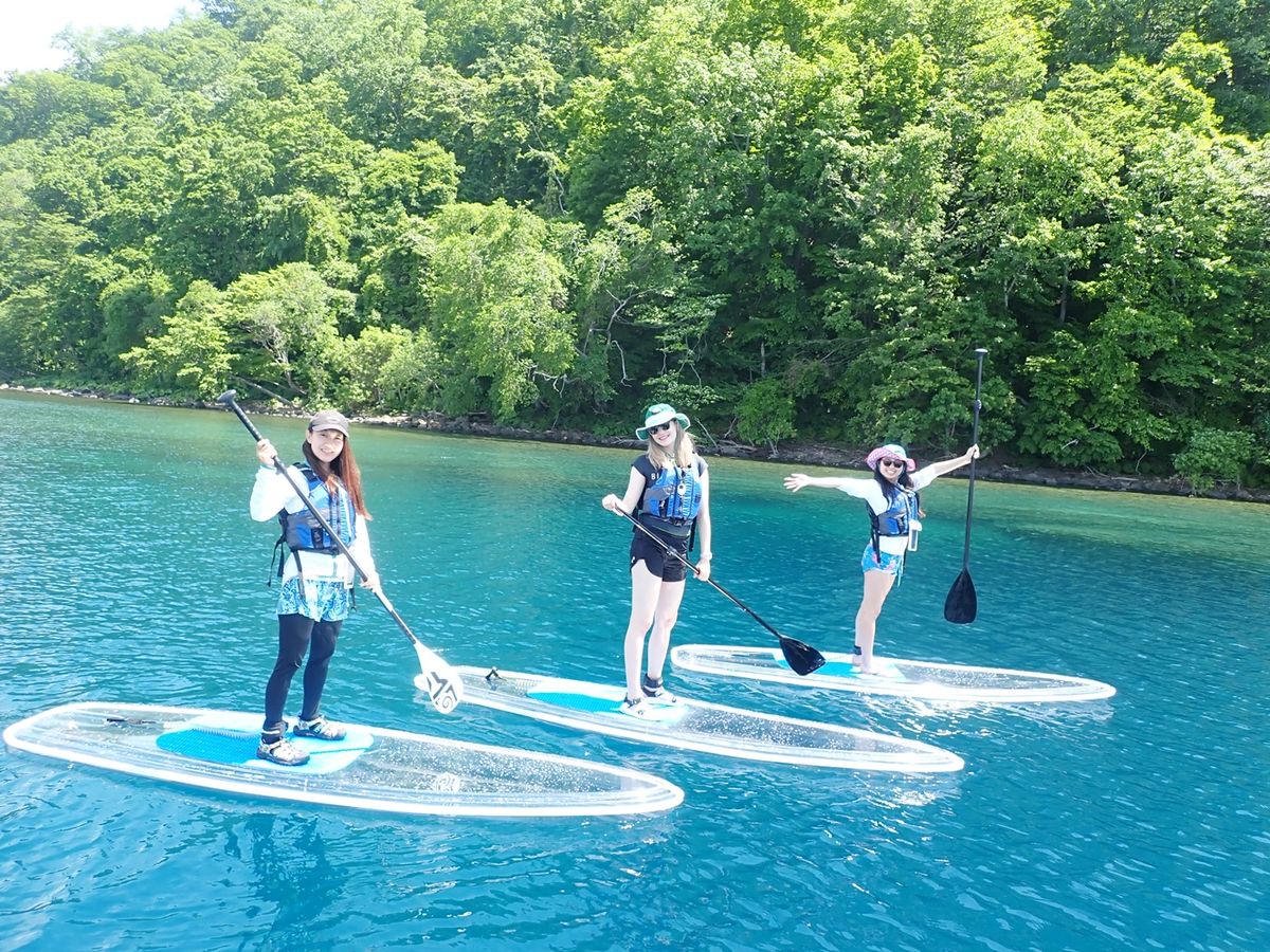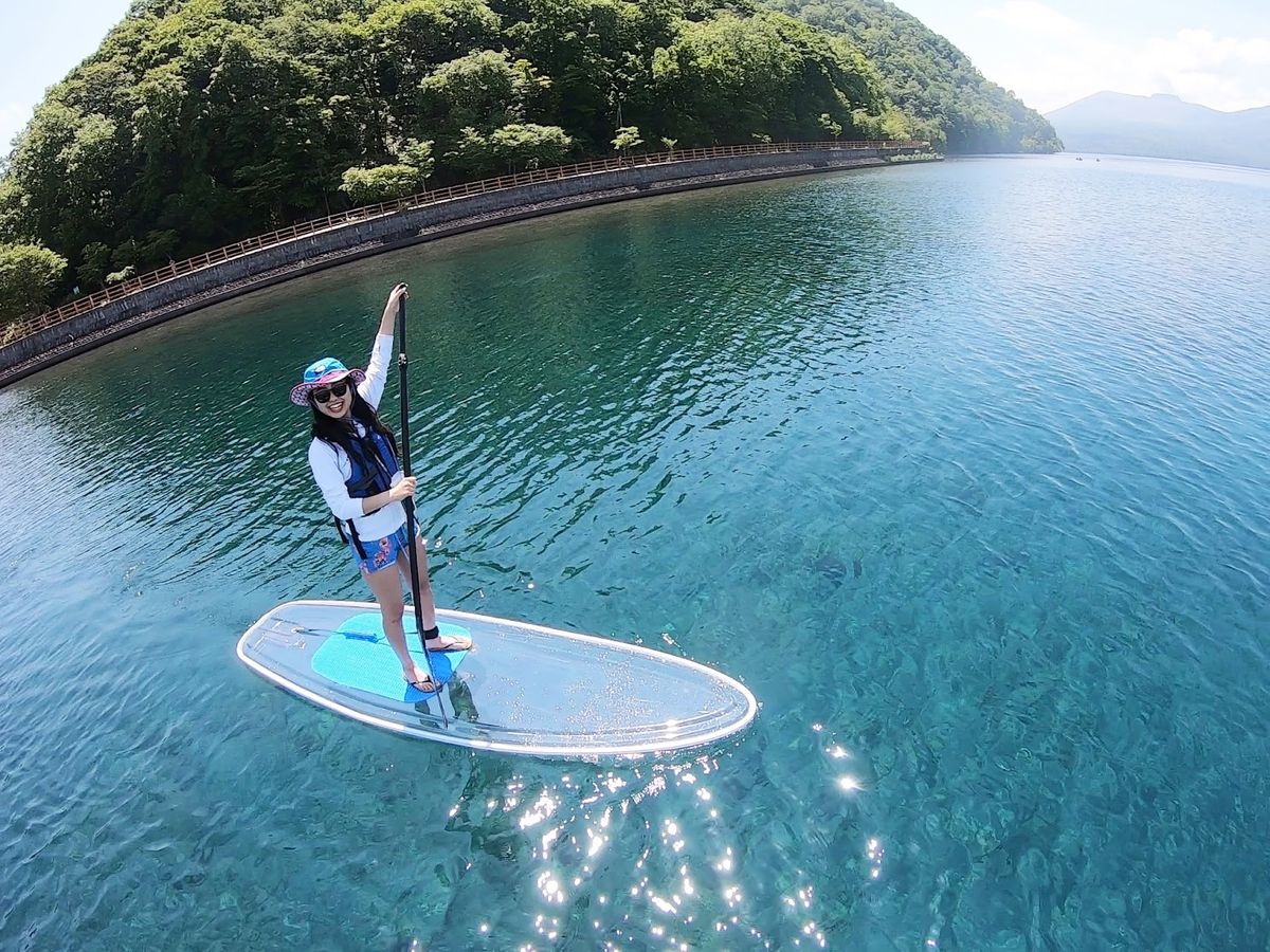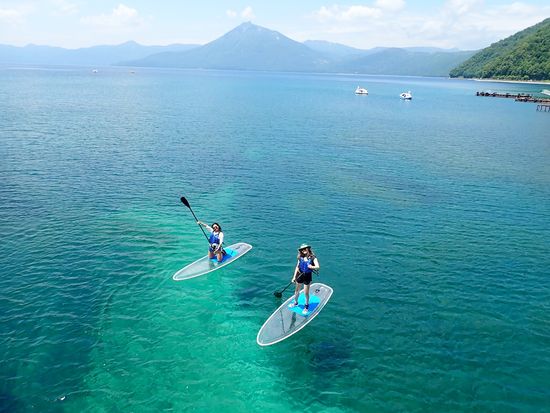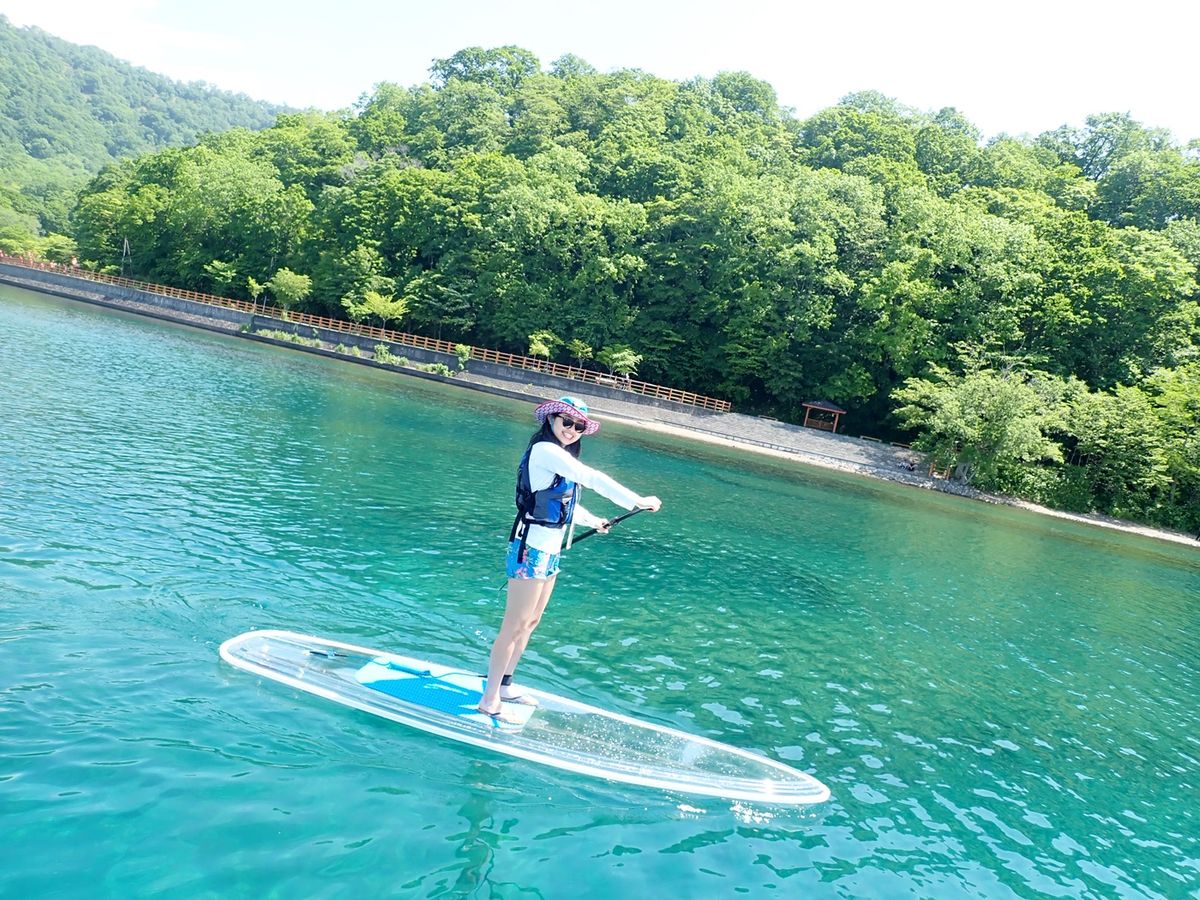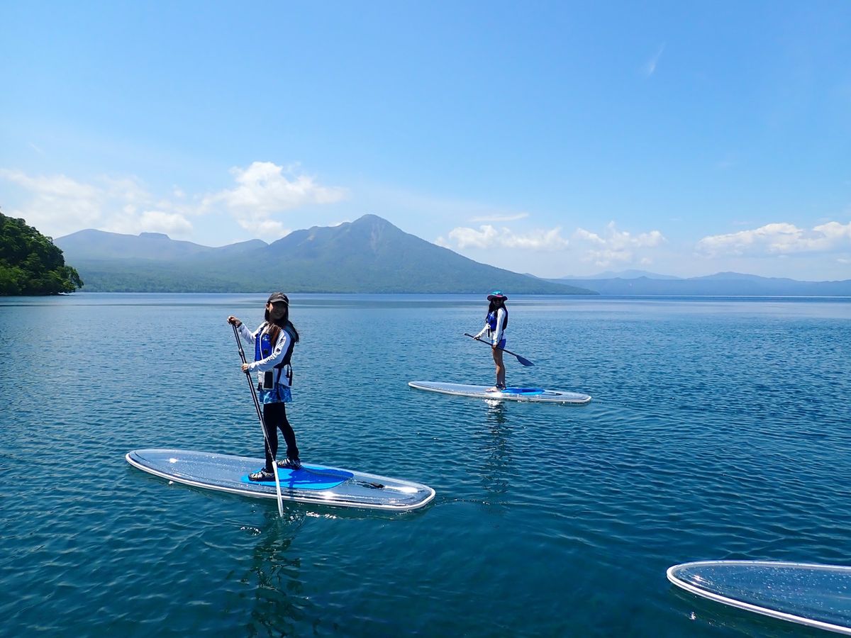 Experience the sparkling blue waters of Lake Shikotsu on a transparent board. The large, stable board ensures even beginners can enjoy with ease. Free equipment rental and photo data from the tour are included!