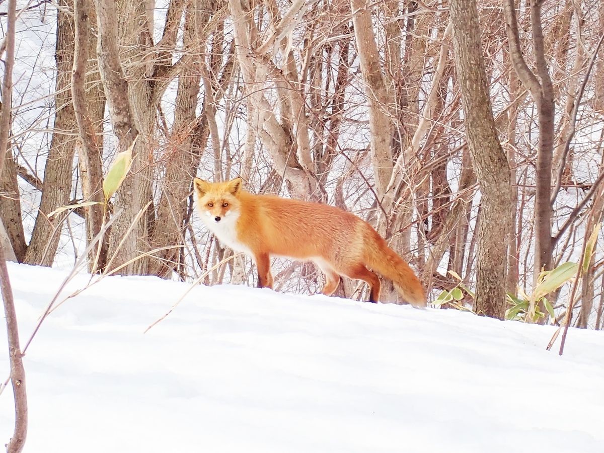 A red fox walking through the snowy forest