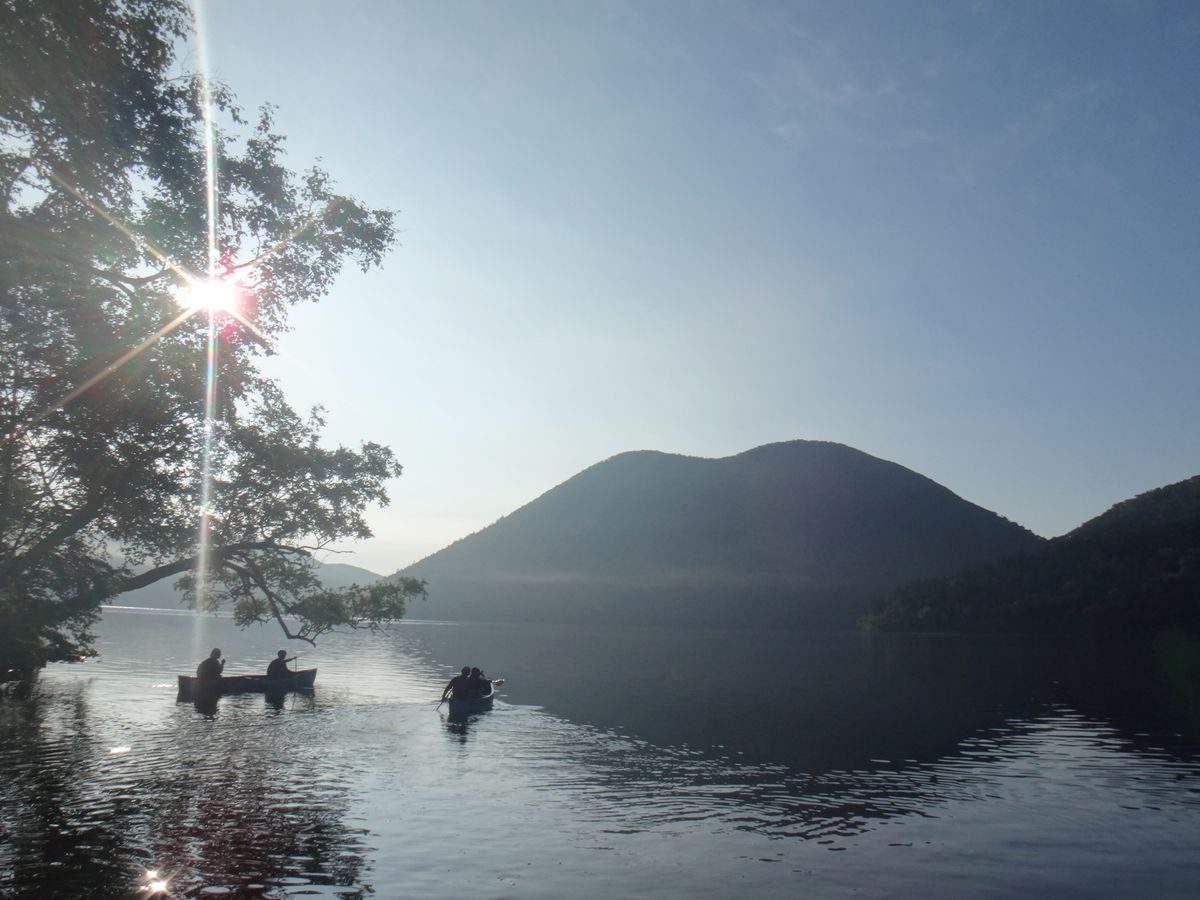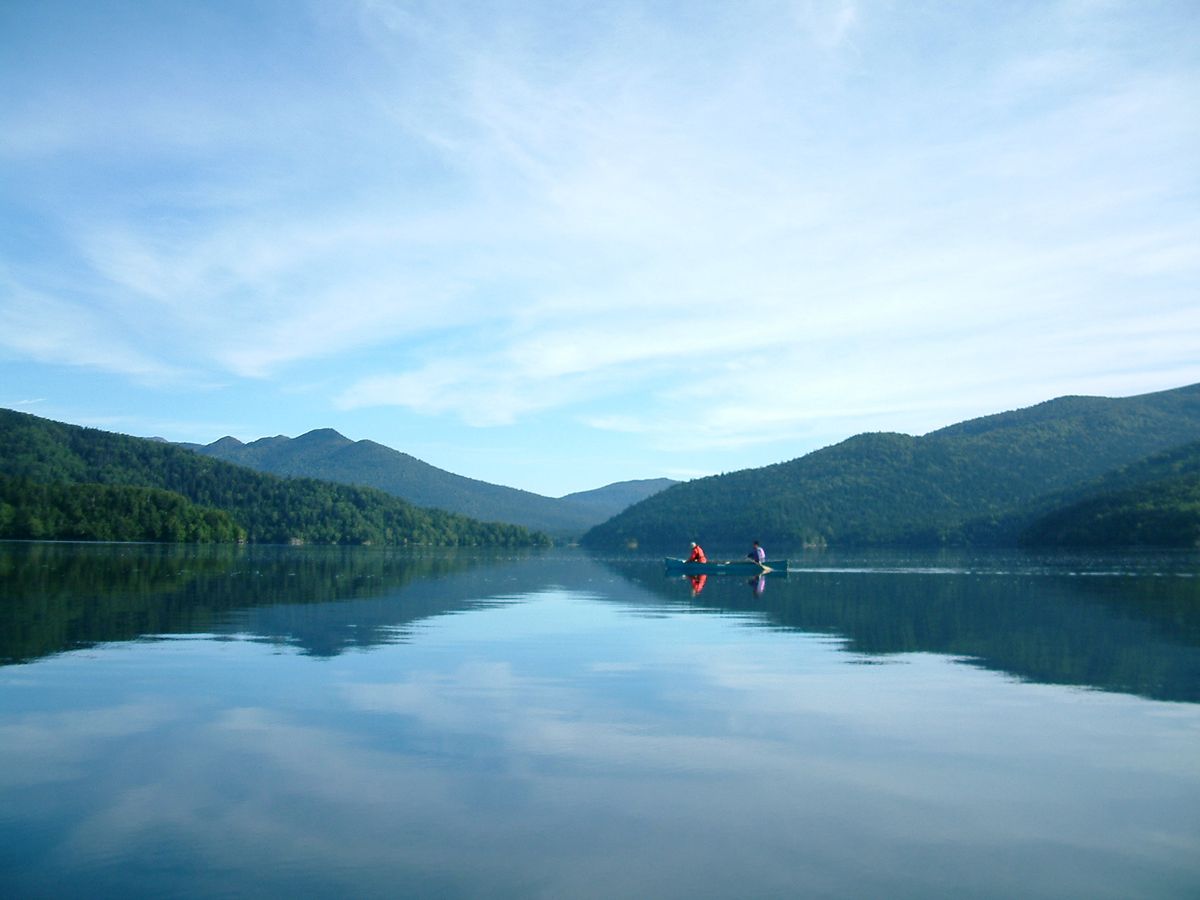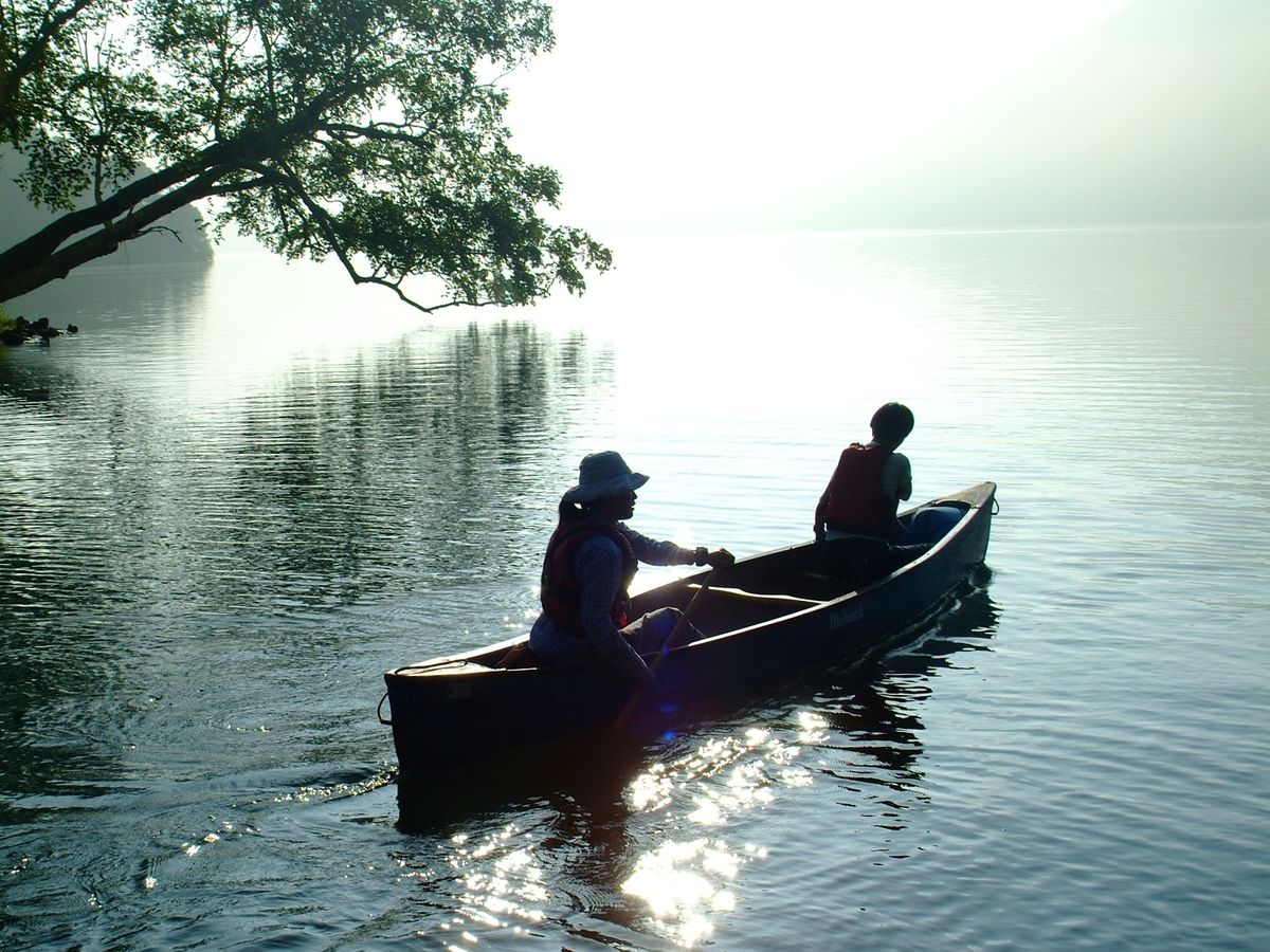Let's paddle a Canadian canoe on the crystal-clear lake, where on a sunny day, you can see the rocks on the lake's bottom and the swimming fish. You'll operate one canoe per pair of two, so let's paddle together and work in harmony.