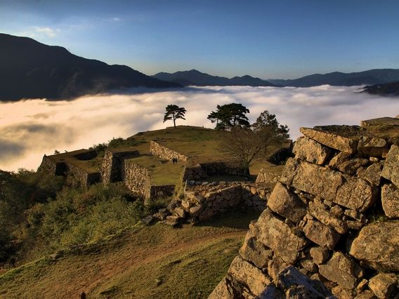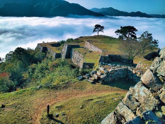Step into history at the Takeda Castle ruins and see the land spread out below you. In the morning the peaks rise over a sea of clouds, seeming to float in the heavens.