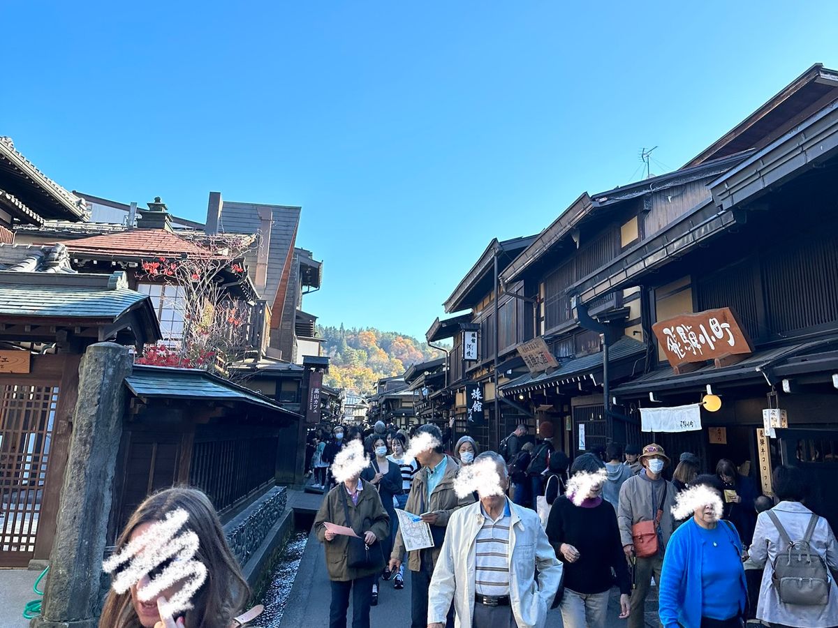 この日は雲ひとつない晴天と彩り豊かな紅葉に恵まれて、絶景の白川郷、飛騨高山を散策することがでした。道中も山々の全面に紅葉が見られ、ひたすらに美しかったです。
