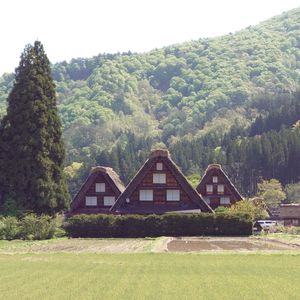 Thank you for participating in our tour the other day. The attached image shows the rice seedlings after planting, which are a deep green and beautifully highlight the gassho-zukuri architecture. Thank you for the lovely photo.