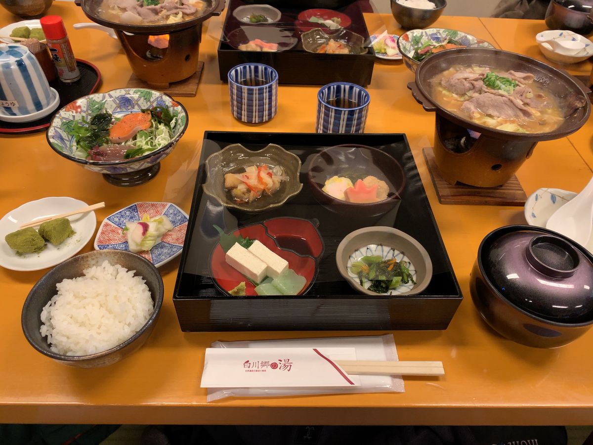 お昼は白川郷唯一の温泉施設内の宴会場で、山の恵みをご馳走になりました。これがまた美味!特に山菜と味噌には感動しました。