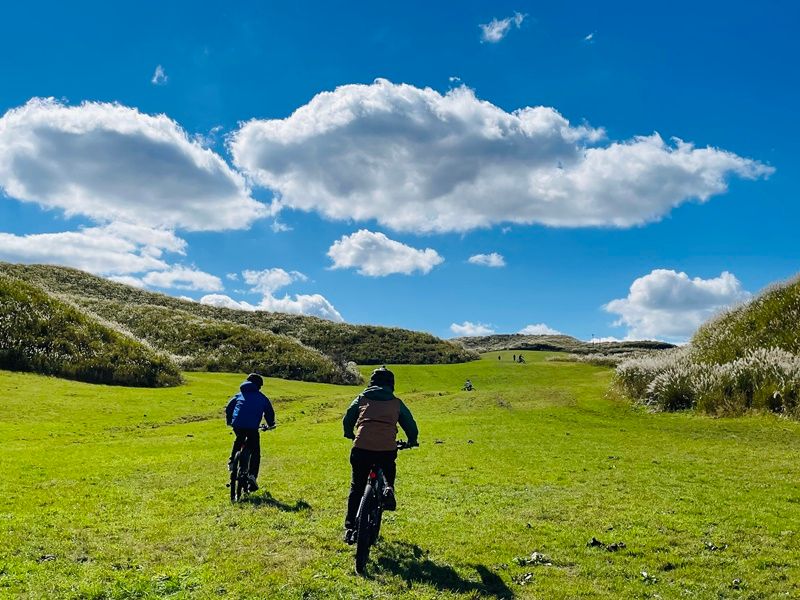 This plan lets you ride freely through the meadows on an electric-assist bike. Perfect for everyone—for all ages. With a guide, it's safe and educational. Convenient meeting point near Aso Station. Feel the grandeur of Aso's nature up close!