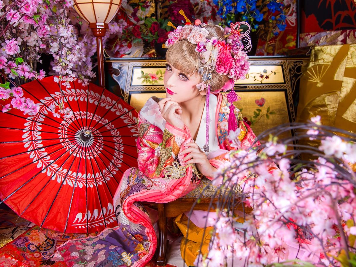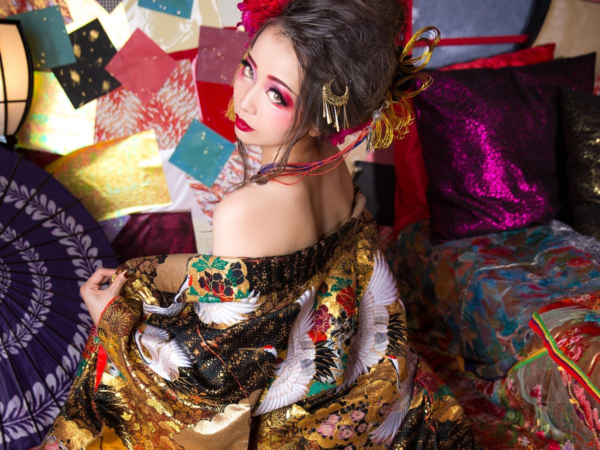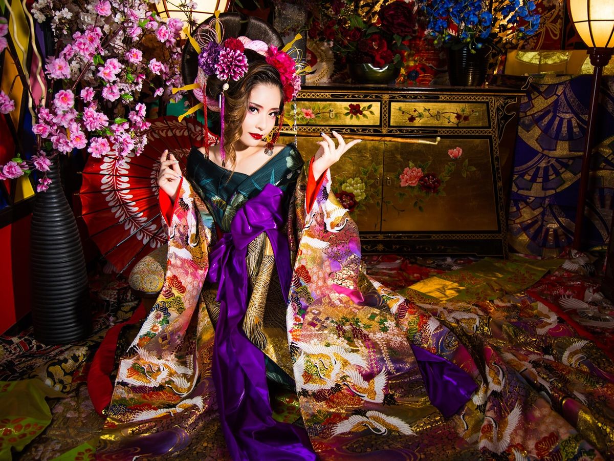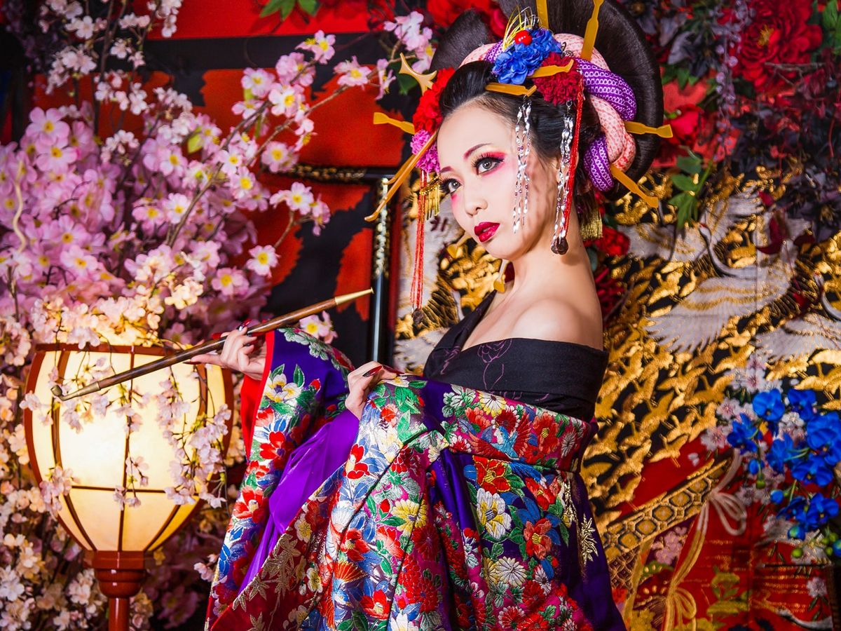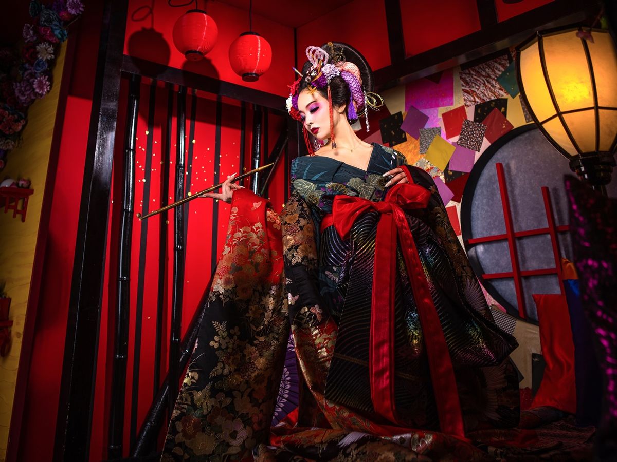 Transform into a stunning oiran with a modern twist. With professional make up, adorn yourself with a decorative kimono and get helpful dress-up and makeup assistance to take glamorous photos in a beautiful studio.