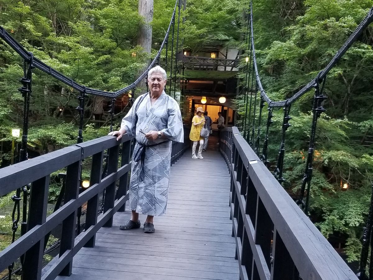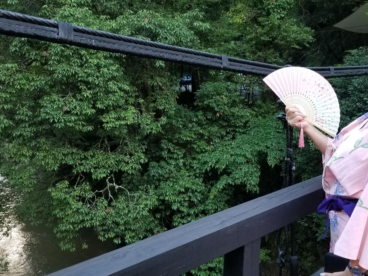 summer kimono on the footbridge over the river