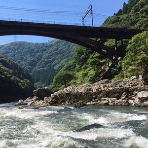 You might get splashed with some water, but in the summer, you'll dry off quickly. Depending on the weather and water levels, I think it's a safe and enjoyable river descent even for children. Don't forget to wave at the trolley train when you encounter it! The summer sunshine, the green mountains, and the sound of the river are all wonderful.