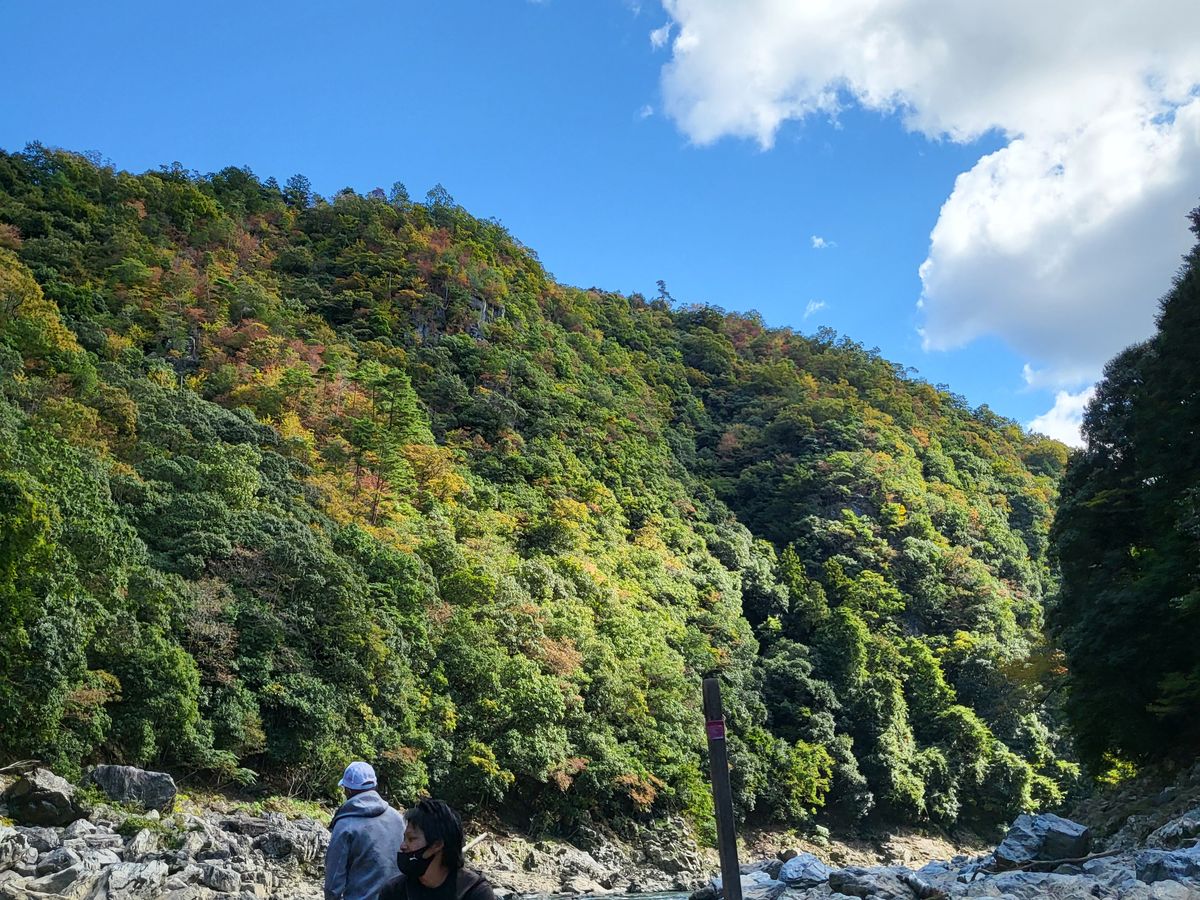 The autumn foliage on the Hozu River was still early, but the trip lasted nearly two hours, and I really enjoyed immersing myself in nature. The water was clear enough to see the riverbed. There were both gentle and rapid sections of the river, with some areas where splashes of water would hit you. It’s advisable to use the seat next to the boat to prevent getting wet.