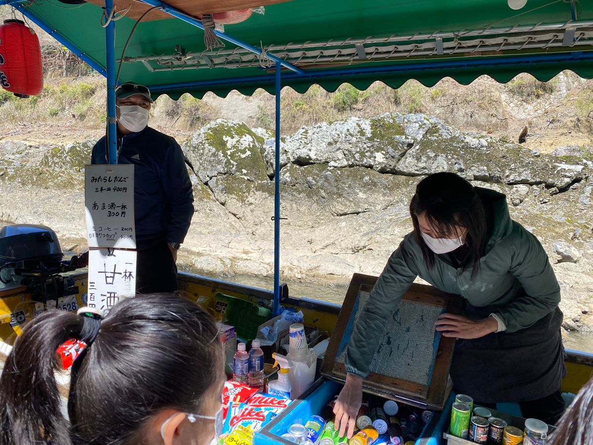 The water flow was low, and we slowly went down the river for two hours. With three guides leading us in a fun way, we were able to enjoy ourselves without getting bored. At the end, a boat from the shop came, and we had delicious mitarashi dango! The cherry blossoms were still around, and the scenery was beautiful, so I think I will visit again during the autumn leaves or when the water flow is strong. Wearing masks and not cramming too many people in, I believe we can still enjoy it even during the COVID-19 pandemic.