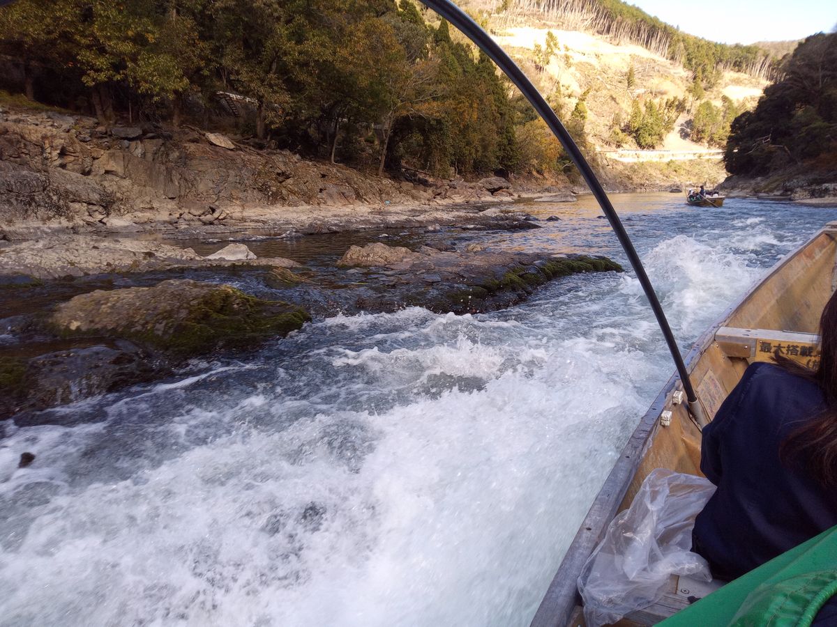 つい3,4日前に強風があったこともあり、紅葉の季節を外れてしまいましたが、ところどころ美しいもみじの川辺を、2時間かけてくだりました。水深がかなり低く、舵を取る船頭さんも、息を切らしながらそれでもユーモワーたっぷりの会話で楽しませてもらいました。水しぶきはほとんどかかりませんでした。