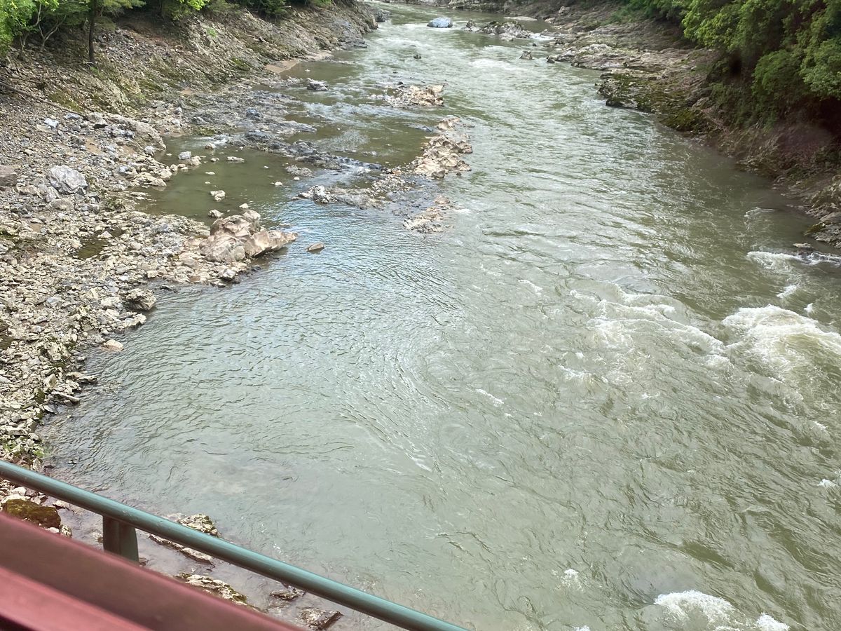 The cherry blossoms have ended, and we are in the green season before the rainy season. On the way there, we took the trolley train, and on the way back, we went down the river. At first, the river was monotonous, and I was a bit tired from sightseeing yesterday, so I couldn't help but yawn. However, after the midway point, the river became more varied, giving a bit of a roller coaster feeling. If the surrounding scenery had been cherry blossoms or autumn leaves, it would have been even more enjoyable.