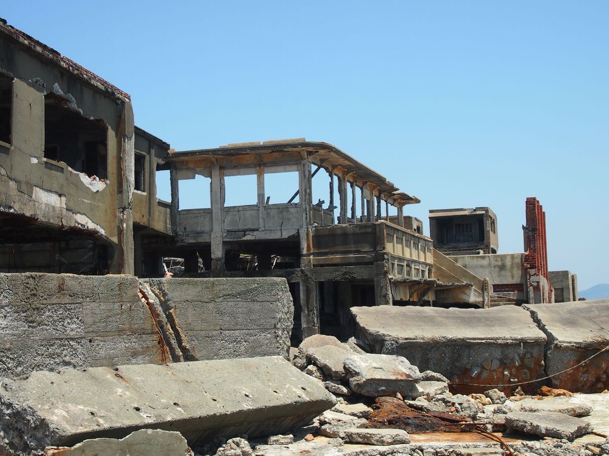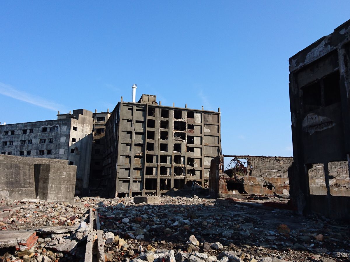 海上から見る端島は本物の軍艦のようで、周遊していただいたので写真をたくさん撮影できました。上陸すると朽ちた建物の威圧感と空の青さが印象的でした。