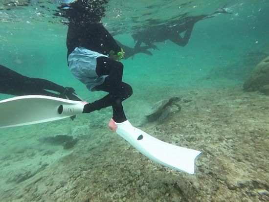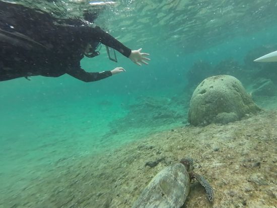 シュノーケリングでは、ウミガメの他、隠れクマノミやチョウチョウウオ、ツノダシなど熱帯魚を多く見る事ができて良かった。宮古島は魚種がとても多くお薦めです。ツアー案内に記載ないですが、ウェットスーツは貸してくれます。それでも海から上がると、さすがにこの時期は寒かったのですが、ガイドの方がお湯の入ったペットボトルを用意してくれていて助かりました。