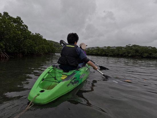 午前中はマングローブ林でのカヌー体験でした。かなりの強風で最初は漕ぐのが大変でしたが、マングローブ林に入ると風が遮断され、漕ぎやすかったです。あいにくの曇天でしたが、大自然を身近に感じながら非日常的な経験ができました。