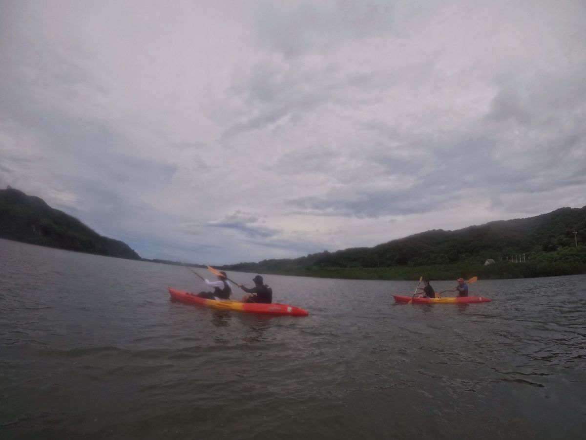 カヌーが6名、カヤック2名をれんちゃんから注意事項の説明を受け、一緒にマングローブの生える海に近い川をくだりました。漕ぎ方によりそれぞれのす速度や方向がまちまちで、カヤックのメンバーはカヤックから落ちて苦労していましたが、れんちゃんが最後まで連れ添って無事に戻ってこられました。