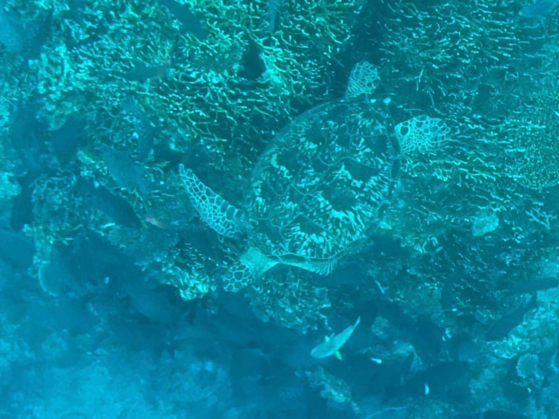 Although it was unfortunately a cloudy day, the sea looked beautiful. I felt happy when I saw a sea turtle.