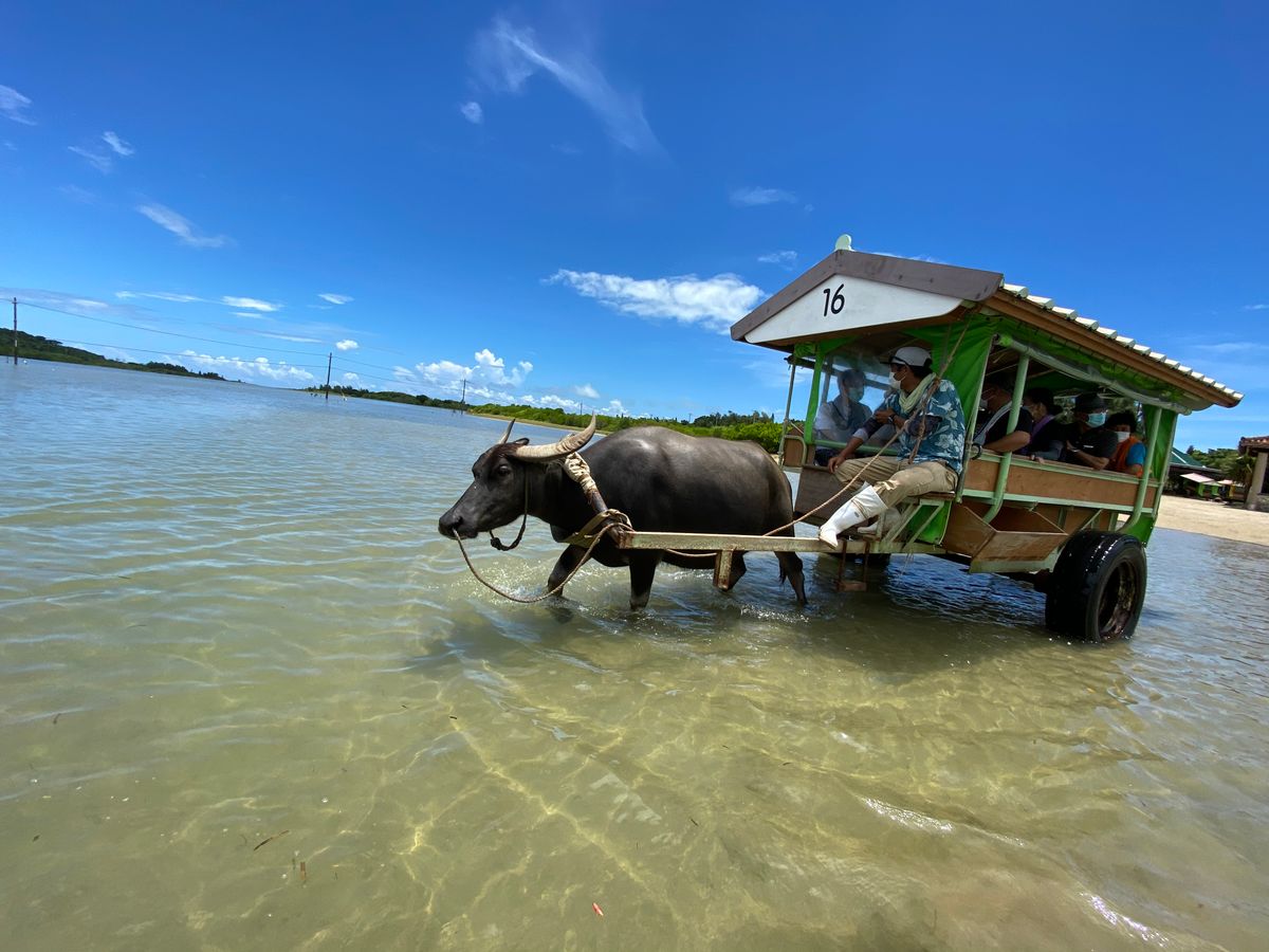 Due to the typhoon, it was cloudy and rainy. The morning cruise around Iriomote Island was cloudy. Unfortunately, we couldn't see the mangrove roots due to high tide. We crossed to Yubu Island on a water buffalo during high tide as well. After that, it rained on Taketomi Island. During a brief break in the rain, we cycled to Kaiji Beach. Since we were short on time, we couldn't search for star sand and had a busy cycling experience. The weather really affects the islands. Next time, I want to go when it's sunny!