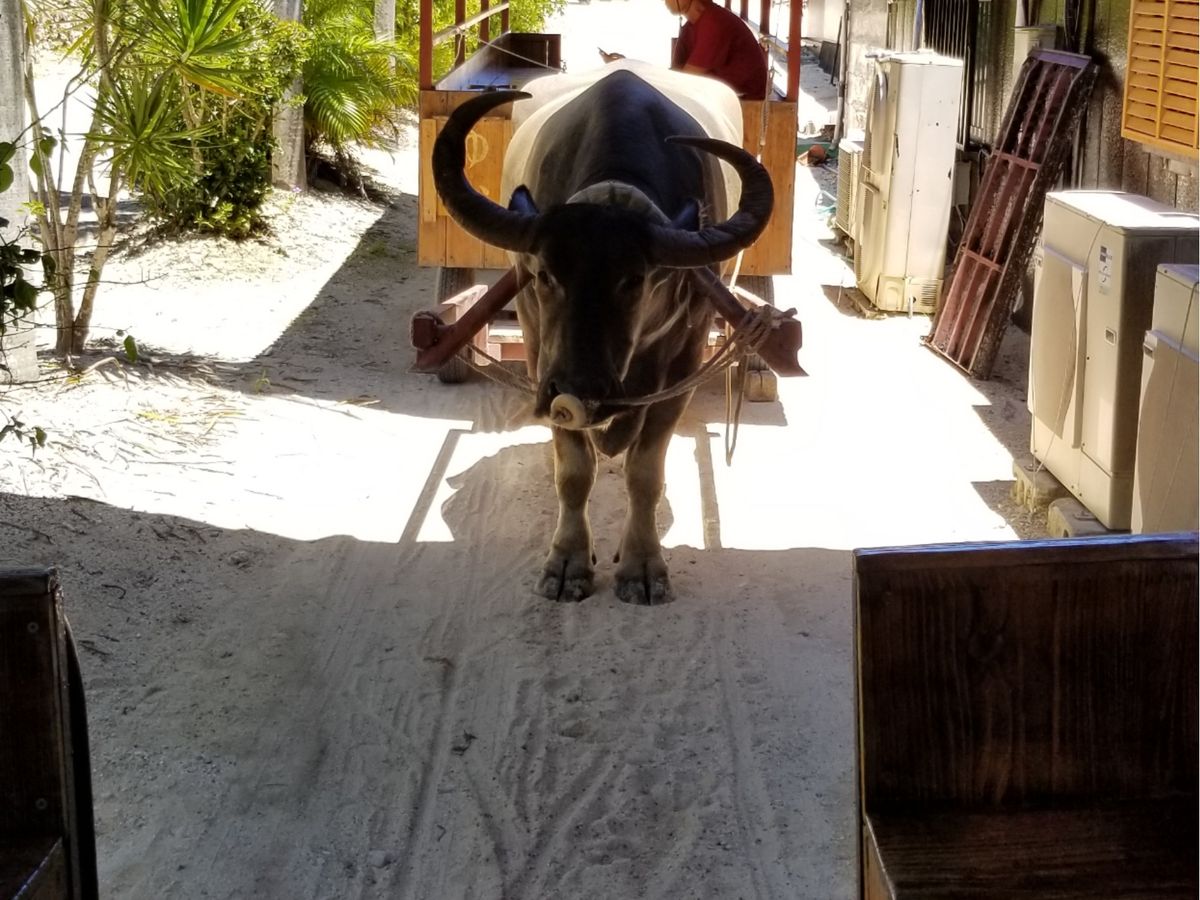 Taketomi Island had a relaxed atmosphere. The water buffalo cart moves along at the pace of the water buffalo.