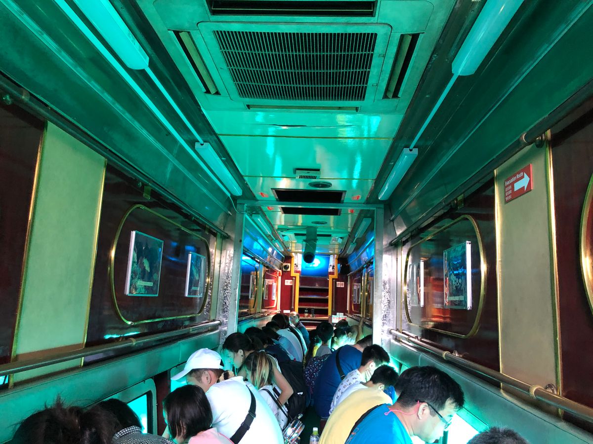 チェックイン時刻に遅れてしまいましたが、乗船開始は5分前だったので間に合いました。船内は、外国の方が多めでした。ポイントに着くまでは、外の眺めを楽しみました。ポイントに着くとスタッフの方が知らせに来てくれて、水中鑑賞室へ移りました。思っていたより、たくさんの魚を見ることができました。エサをまいていたのか、群れで表れたりもしました。あっという間に時間が過ぎ、15分ぐらい鑑賞すると修了のお知らせがあり、デッキに戻りました。