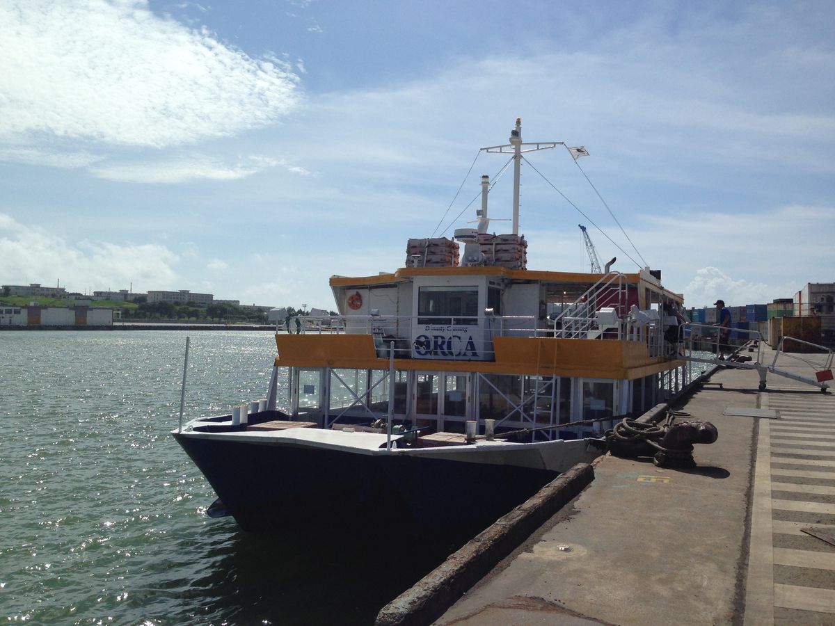 さて、案内されたオルカ号は案外普通の船でびっくりしました。私はいかにも潜水艦をイメージしていました。・・イエローサブマリンみたいな。これが海の中潜るの?違うよね、と。