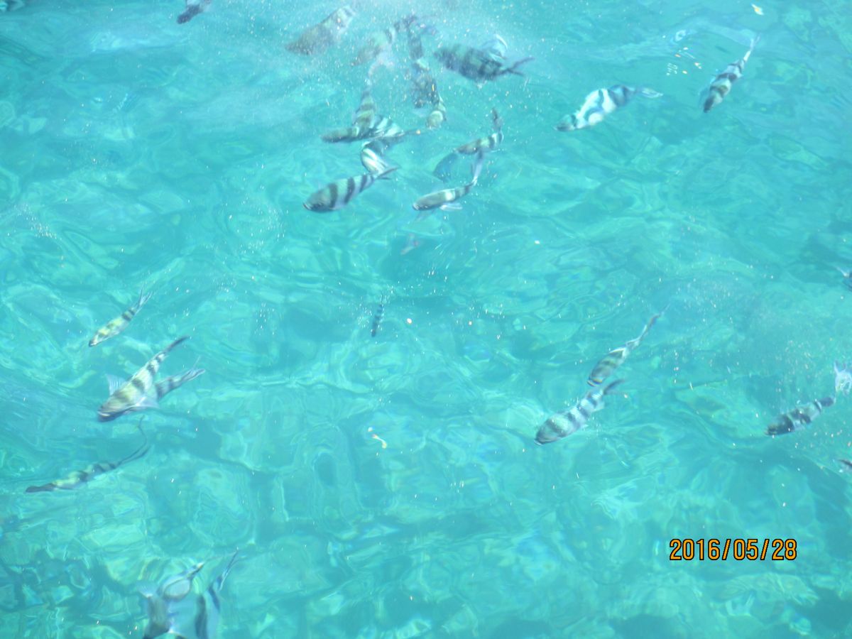 ポイントにつくと、係員の方が餌をまくので、魚がたくさん集まってきました。鑑賞室よりも、船上からの方がはっきり見えました。