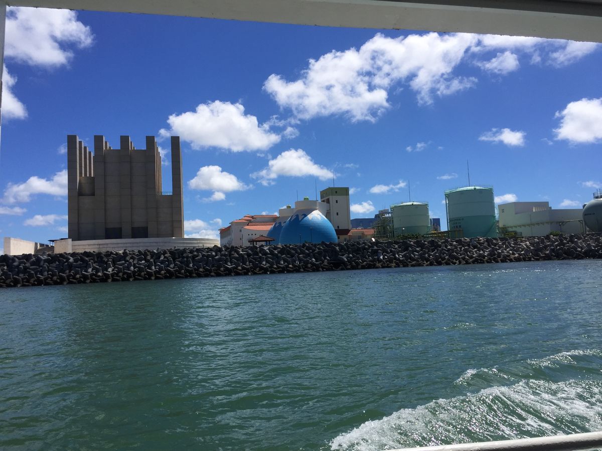 海風と海からの那覇市内の景色を楽しみながら走ること15分。いよいよ海中部屋へ入ります。