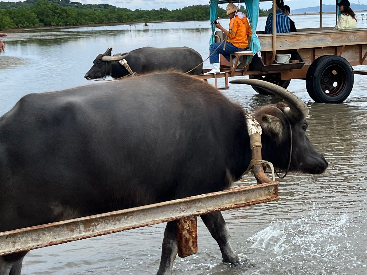 First, we took a ferry to Iriomote Island. From Iriomote Island, we boarded a boat to see the unique mangroves. Then, we crossed over to Yufu Island riding on a water buffalo, which was a valuable experience.