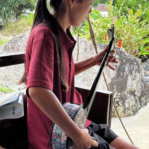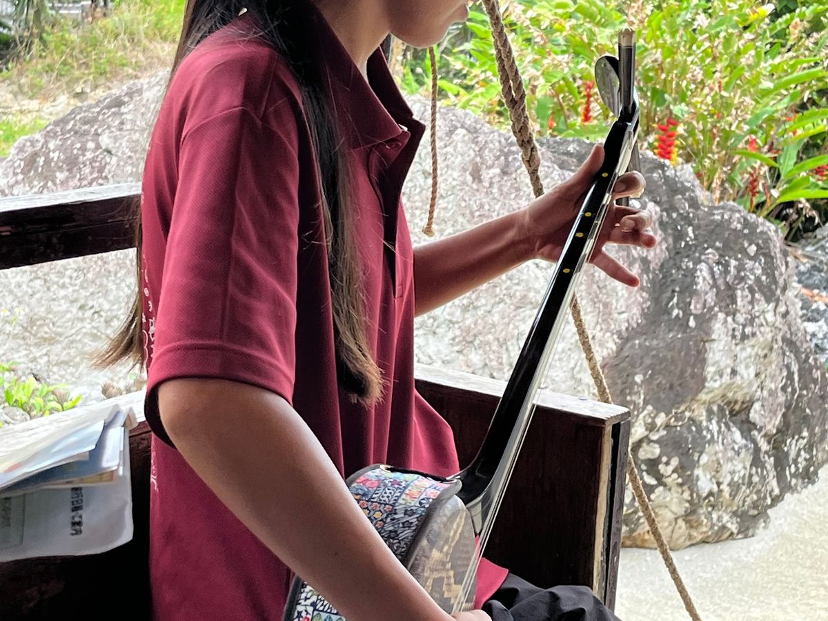 The sanshin performance during the bus ride was challenging, but both the performance and the songs in the local dialect were very well done, and above all, the voice was beautiful 🎤👧🏼.