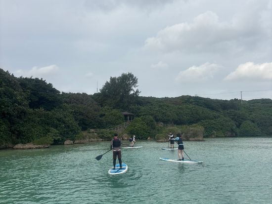 I had the opportunity to experience three activities: the Pumpkin Cave, stand-up paddleboarding (SUP), and snorkeling with sea turtles. The first two activities were led by "Kazukun with a Smile," and the final snorkeling was handled by "Mio"!