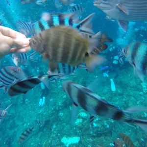 After playing for a while, we headed back from the cave. On the way, when we tried feeding the fish… they all came rushing in! Energetic fish swarmed around us, it was so much fun!