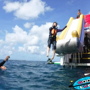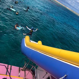The staff were all very bright, refreshing, and polite in their responses. Even though they are young, they know how to provide good customer service, and I didn't have any unpleasant experiences at all! Their spirit of service was also strong! However, due to the typhoon, we didn't go to Kerama and instead snorkeled at a nearby spot, which was particularly unimpressive. There were also people fishing right near the snorkeling point, so it wasn't worth paying 5,000 yen. Next time, if it's going to be a nearby location, I will cancel! The slide was fun! The boat was rocking with the waves, and many people got seasick!