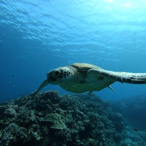 那覇港を出て魚のいるポイントに着いたところで早速ウミガメが泳いでいて感動しました!子供もカメさんカメさんと大喜び。サンゴ礁もお魚も沢山見ることが出来、子供が楽しんでいる姿を見られて良かったです。