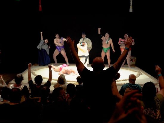 抽選で選ばれると、相撲スーツを着て力士に挑戦