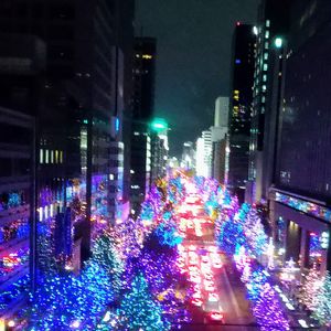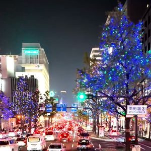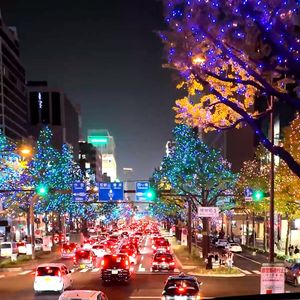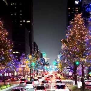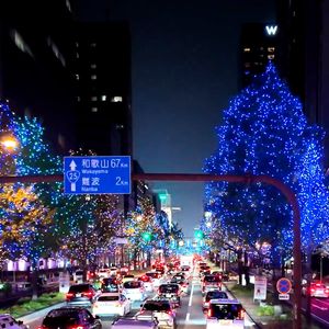 The street trees along Midosuji were beautifully lit with colorful illuminations, and the view from the highway was also lovely and enjoyable.