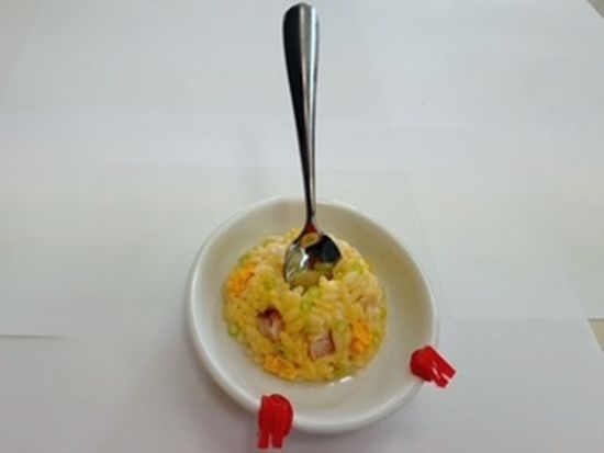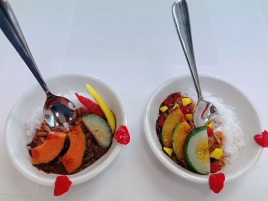 This plastic model of a local favorite, curry rice, looks good enough to eat! Carefully place the meat, veggies and red ginger pickles, before covering them with sauce.