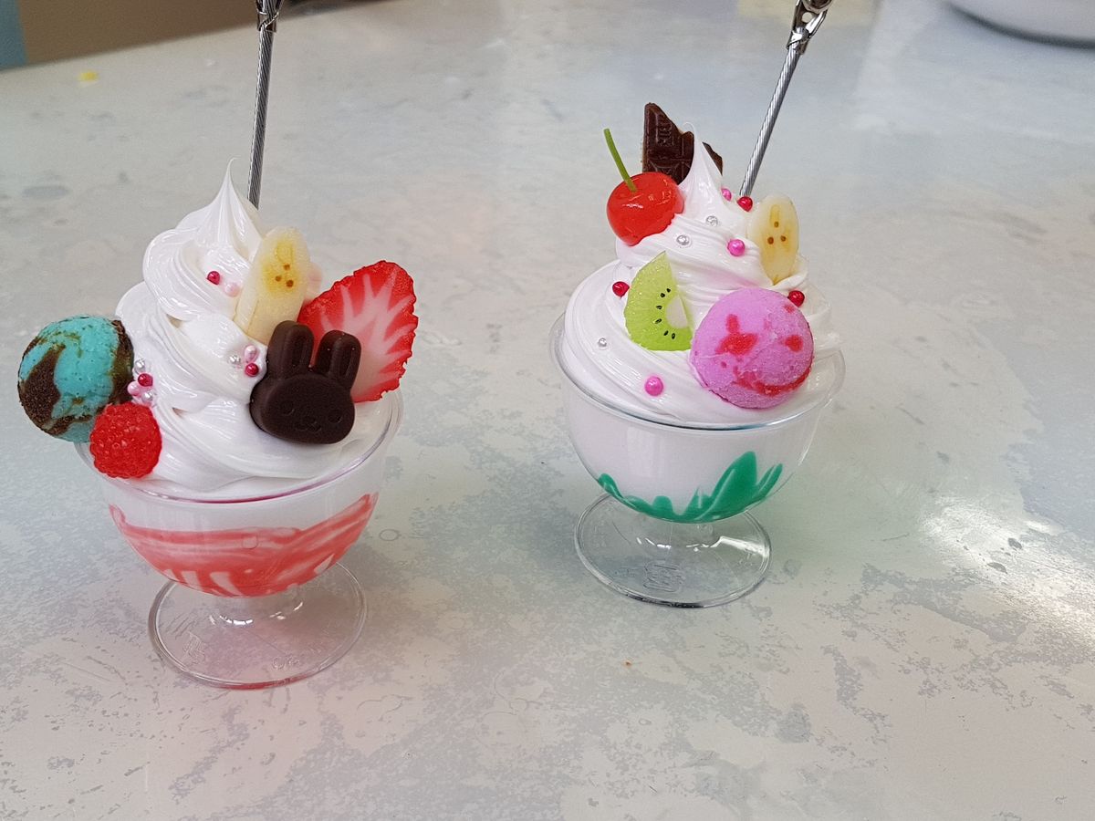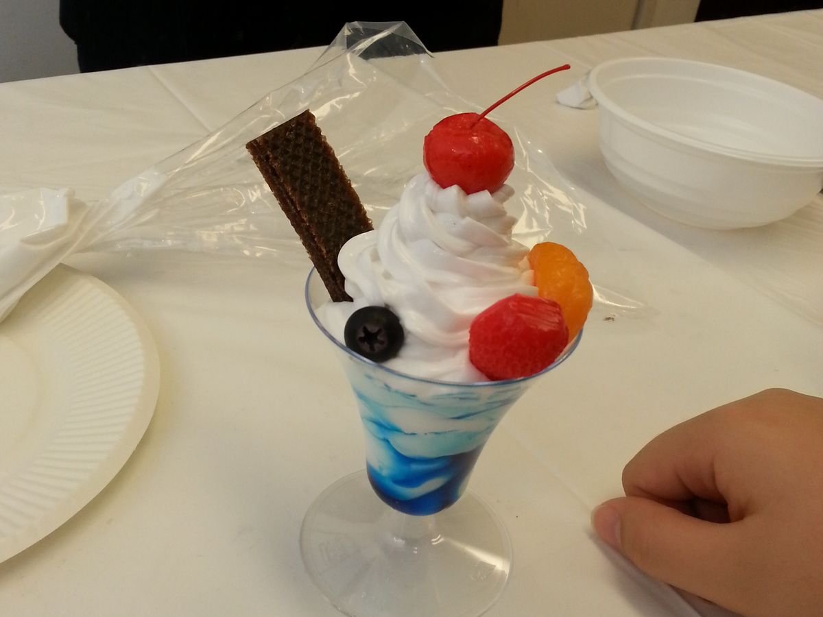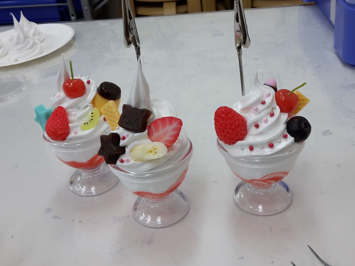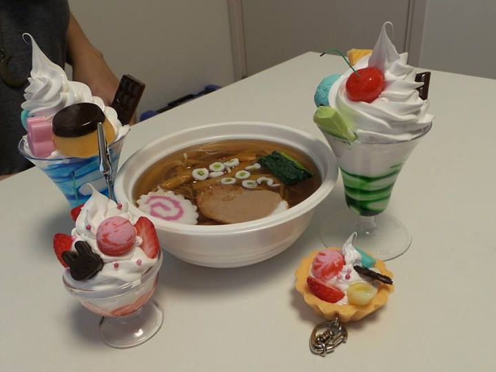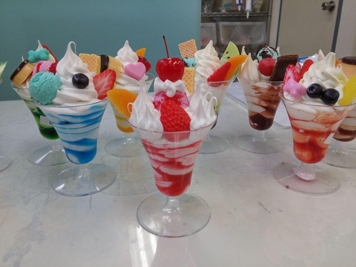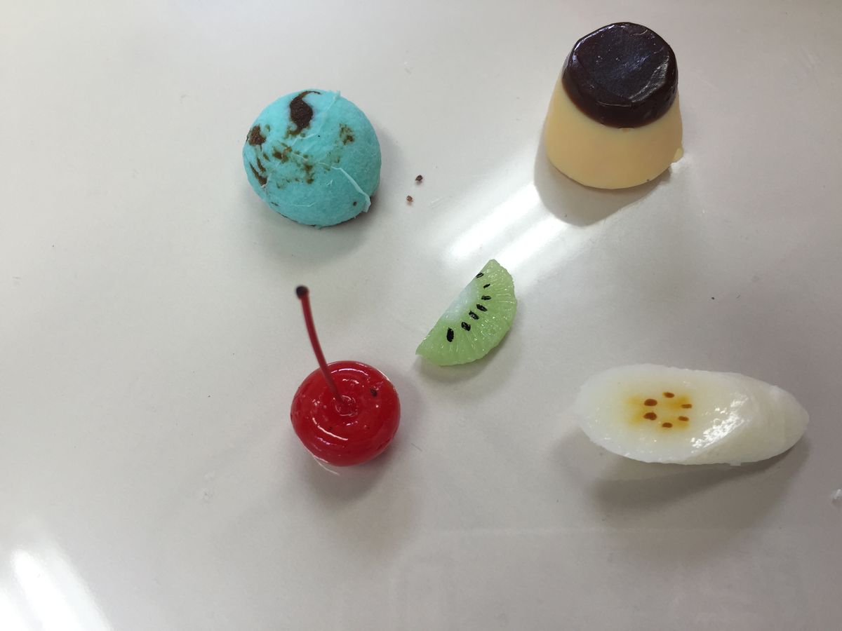 2 large sundaes, 1 cupcake photo holder, 1 tart keychain, and 1 ramen bowl sample (and a partridge in a pear tree, lol) made by our group