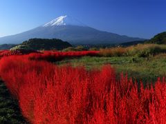 See red kochia bushes against Mt. Fuji