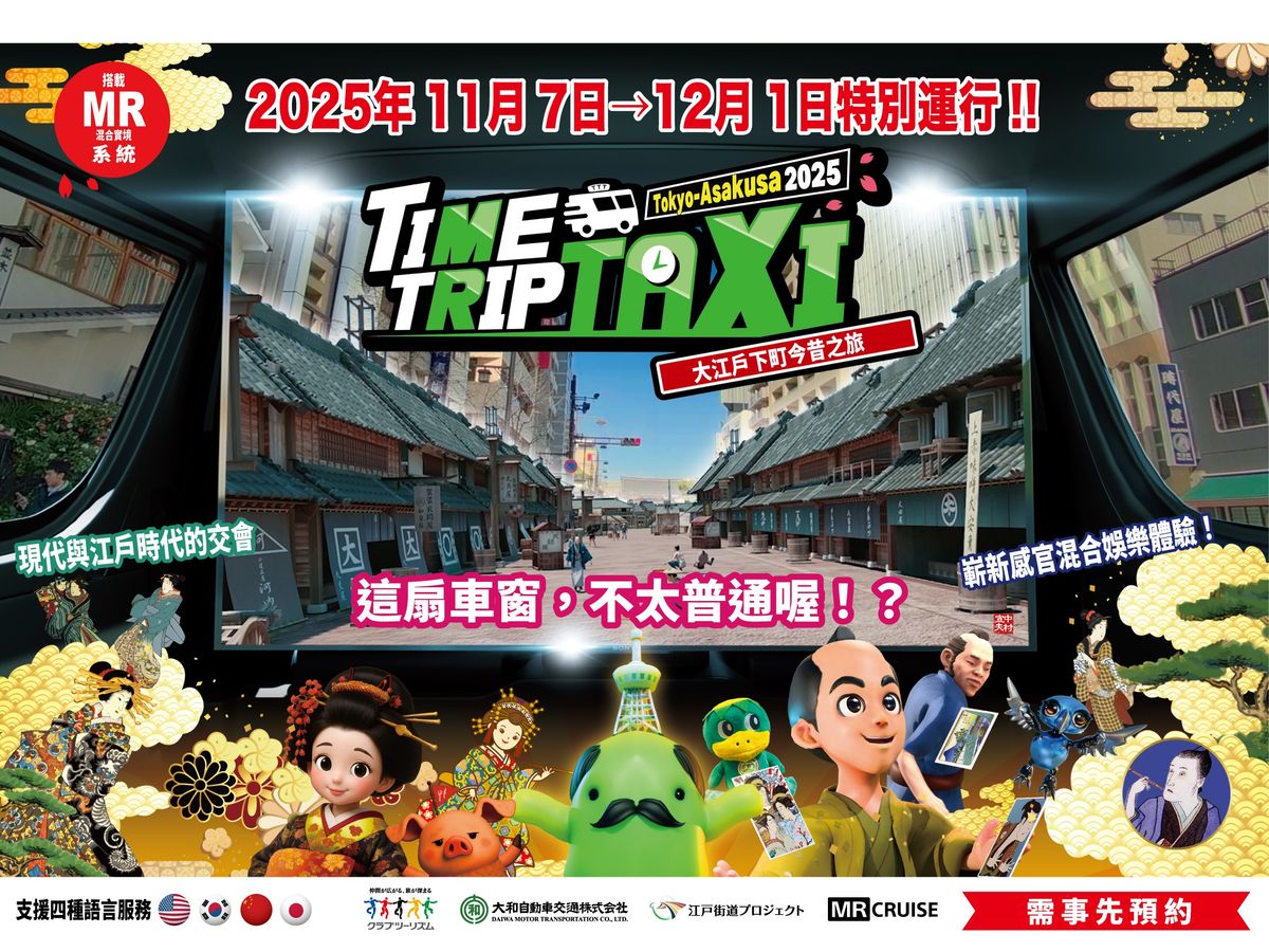 跨越時空的新感覺交通工具——時光旅行計程車,全新升級回歸!搭載4K大型螢幕的特別車輛期間限定運行,連結東京站與淺草,帶您體驗前所未有的沉浸式旅程。車內結合實際景色與影像,彷彿穿越回江戶時代,感受歷史與現代交錯的奇幻瞬間。在導覽影片中,您還能認識延續至今的東京職人文化,深入了解日本傳統工藝的精神與美學。不只是移動,更是一場充滿驚喜的時空冒險!