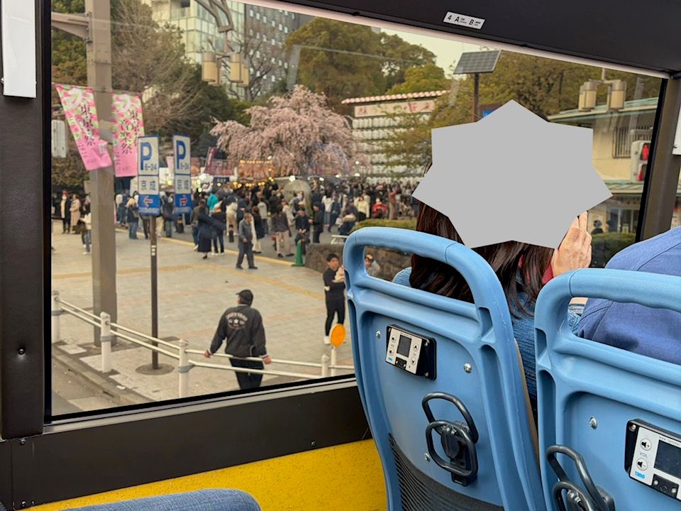 Sitting in a bus seat while touring Tokyo is incredibly comfortable. However, taking pictures of cherry blossoms while wearing a seatbelt is quite challenging... The nearby cherry blossoms are blocked by the window frame, so you can only capture the distant ones within the frame. Therefore, I recommend enjoying the cherry blossoms from the window rather than focusing on photography. ♬