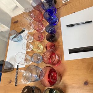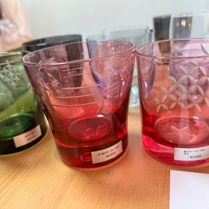 今回2回目の体験です。前回はグラスの形状、カラーが豊富で桜色のタンブラーを選びましたが、今回はカラーのグラスが薄い水色、濃いブルー、濃い赤のみでそれも各色1種類の形状のみでした。今回は会社のOBの集まりで11名参加と言うこともあり、出来るだけお好みのグラスで作成して頂きたかったのですが、結局、透明のグラスを選ぶしか無くて、参加後の感想も「色のグラスがなかったのが残念」と言う声が多数ありました。