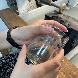 First, I chose a glass and practiced the carving technique. After that, I selected a beginner-friendly design, sketched it out, and carved the glass. I couldn't carve as well as the sample, but I think I did quite well. Even if I made mistakes, I received advice, which allowed me to come up with my own solutions. Those who struggled with carving difficult lines had the staff help them with corrections.