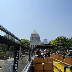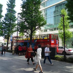 The starting point in front of the Mitsubishi Building is in Marunouchi, Tokyo's office district, where you can see people going about their work. The bus departs while heading towards Kasumigaseki, passing by Tokyo Station. Kasumigaseki is Japan's government district, where you can see the National Diet Building and various ministry buildings. Next to it is the Imperial Palace. As we head towards Omotesando, we can see the moat of the Imperial Palace. Omotesando and Aoyama are where Tokyo's fashionable people gather. By this time, the people passing by have changed from suits to stylish, trendy clothes. Since it's a bus without a ceiling, you can also smell delicious food in the air.
