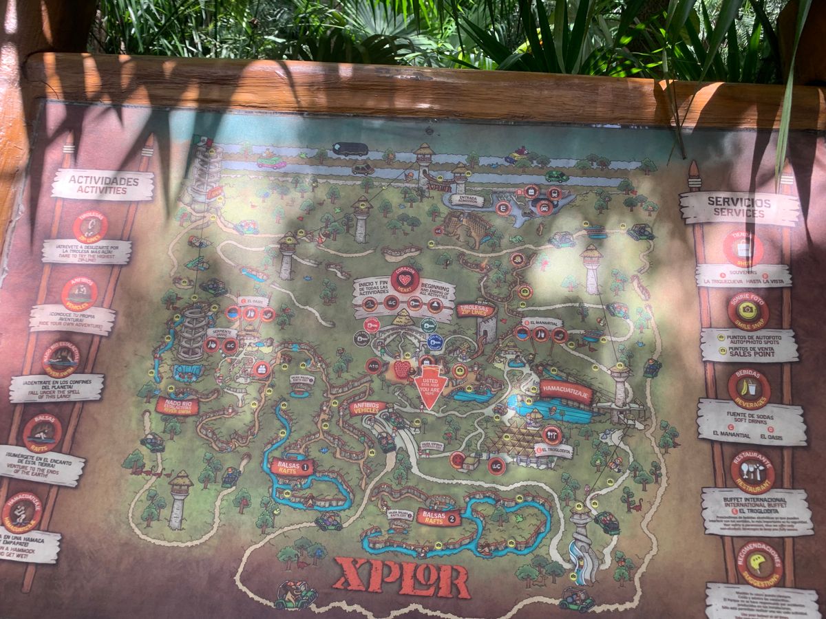 We left the Hotel Zone in Cancun around 7 AM and switched buses around 8 AM to head to Xplor. During the journey, the guide provided explanations in both Spanish and English (including details about two cafeterias and one restaurant, their operating hours, available food, and safety information for each attraction).