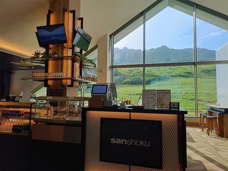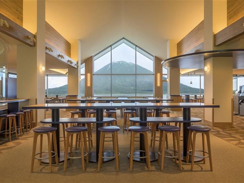 Sanshoku is a glass-walled café/restaurant where the concept is literally “food with mountain views.” From its vantage inside the Mountain Center, you get sweeping outlooks of Mt. Yotei—the iconic “Mt. Fuji of Hokkaido.”