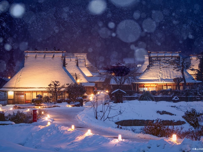 Kayabuki no Sato is a traditional thatched-roof village that feels wonderfully remote yet is doable as an evening trip from Kyoto or Osaka. In winter, the houses are lit with soft illuminations against the snow, creating peaceful, postcard-perfect scenes rather than big-city crowds.