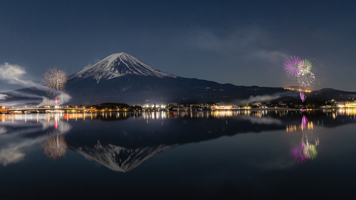 - Evening fireworks over Lake Kawaguchiko with Mt. Fuji towering in the background